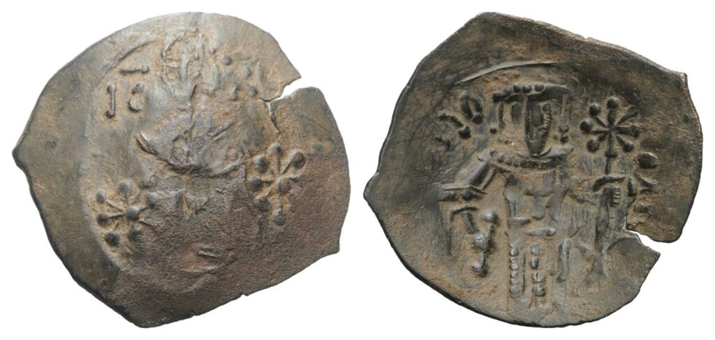 Trachy, Magnesia circa 1222 – 1254 AD, AE. X AP XM Full-length figure of St. Michael the Archangel, nimbate, wearing body armor with pteryges, chiton, and sagion with agrapha, r. hand holding sword l. globus cruciger. Rev. Iω ΔЄCΠOTHC IC XC Full-length figure of emperor and Christ; Emperor bearded, wearing divitision (A3), chlamys (A11 B2 C5), maniakion, and stemma with pendilia, r. hand holding akakia and l. globus cruciger; Christ cruciformly nimbate with up to five pellets in each Cross arm, wearing tunic and kolobion, r. hand outstretched to crown emperor and l. holding Gospels. Sear 2089. LBC 219-20 (incorrectly described, reverse Christ as bearded). DOC XXXII 35 (incorrectly described, reverse Christ as bearded). CNB 3.10A.